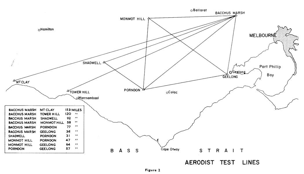 The concluding test in these trials took place over the quadrilateral Bacchus Marsh, Geelong, Porndon, Monmot Hill. The six lines were satisfactorily measured in one day and all equipment functioned perfectly.