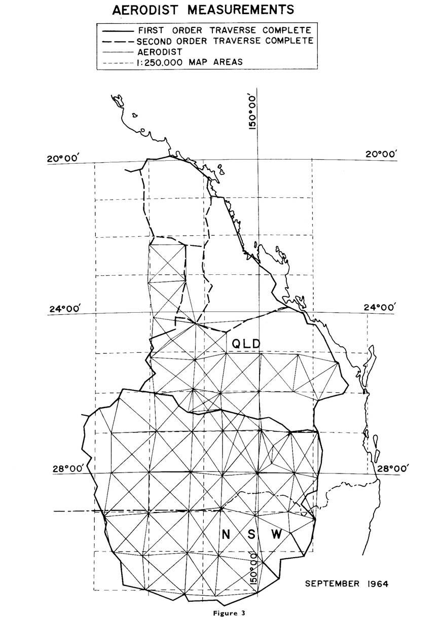 In New Guinea, the Royal Australian Survey Corps has used another set of Aerodist equipment installed in a fixed wing aircraft to trilaterate quadrilaterals each 30' x 30' in arc.