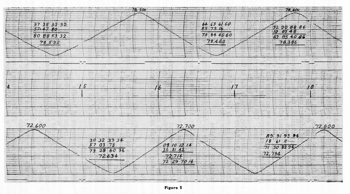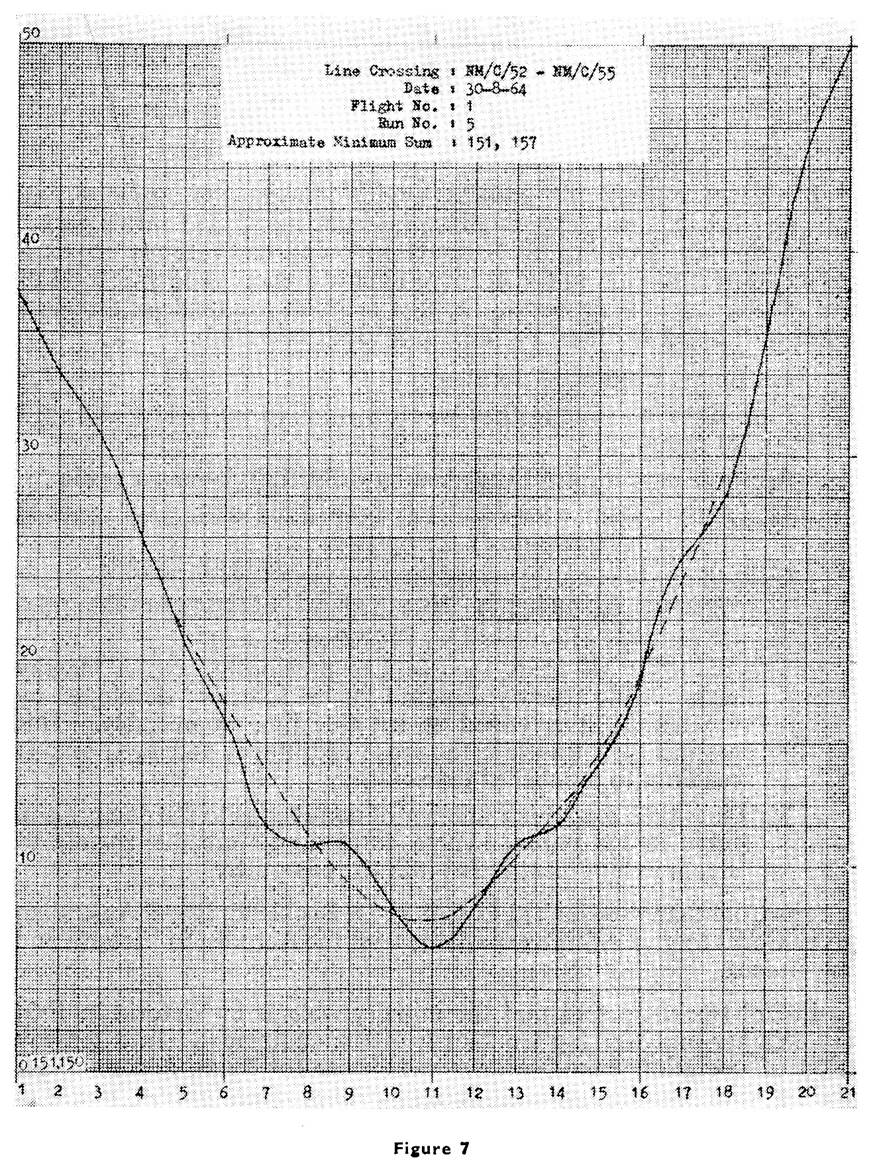 In line-crossing reductions, the charts are examined and pairs of distances, one from each ground station, are extracted and summed for the same number of intervals on either side of the actual line-crossing. As the sums of the distances measured on a line-crossing, graph as a parabola, twenty-one sums, ten on either side of the adjusted minimum are graphed and then computed by the method of least-squares to obtain the theoretical minimum. This may vary from the minimum shown on the graph of the twenty-one sums but the mathematical minimum is considered the better value primarily due to the averaging of possible terrain effects. See Figs 6 & 7.