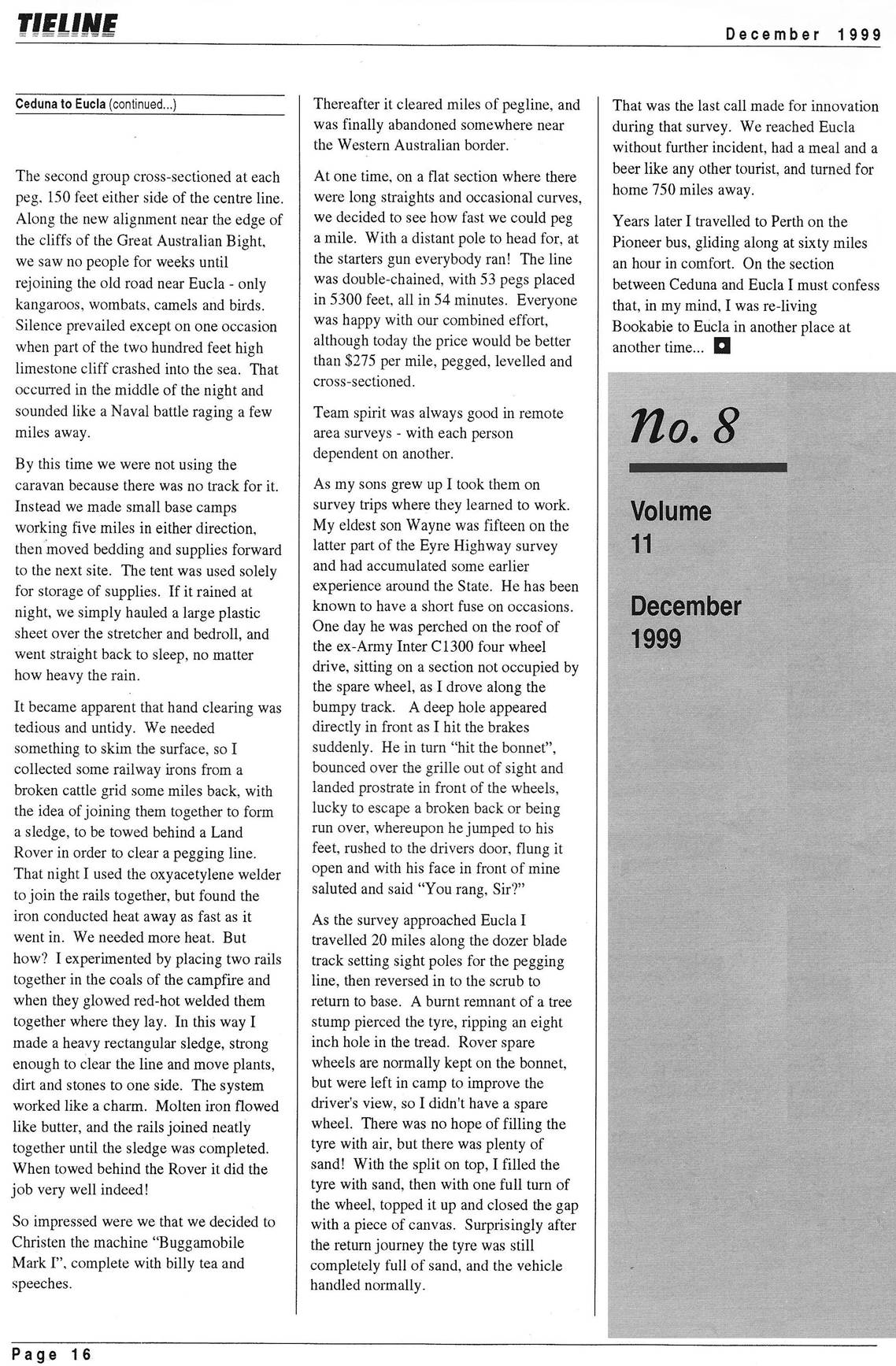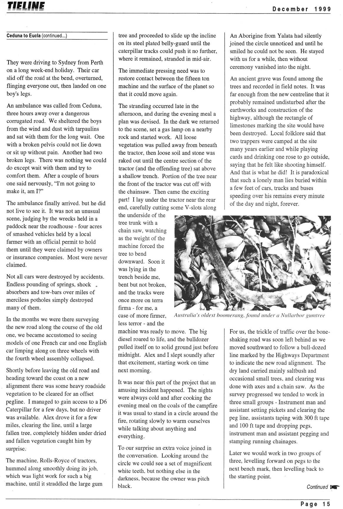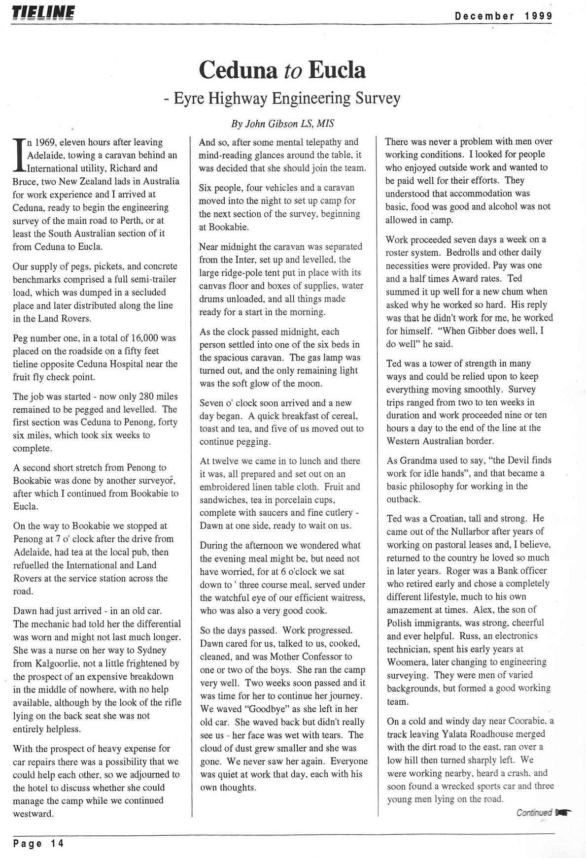 The following article titled Ceduna to Eucla – Eyre Highway Engineering Survey was written by John Gibson and appeared in the Institution of Surveyors, Australia, S.A. Division newsletter TIELINE (December 1999, Volume 11, No.8). It is reproduced with permission.