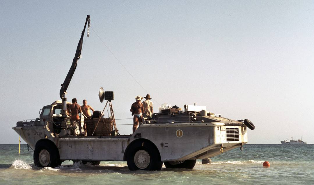 Aerodist station : 1971 Coral Sea (Aerodist remote equipment on LARC over the ground mark on the sand cay with the Cape Pillar in the background)