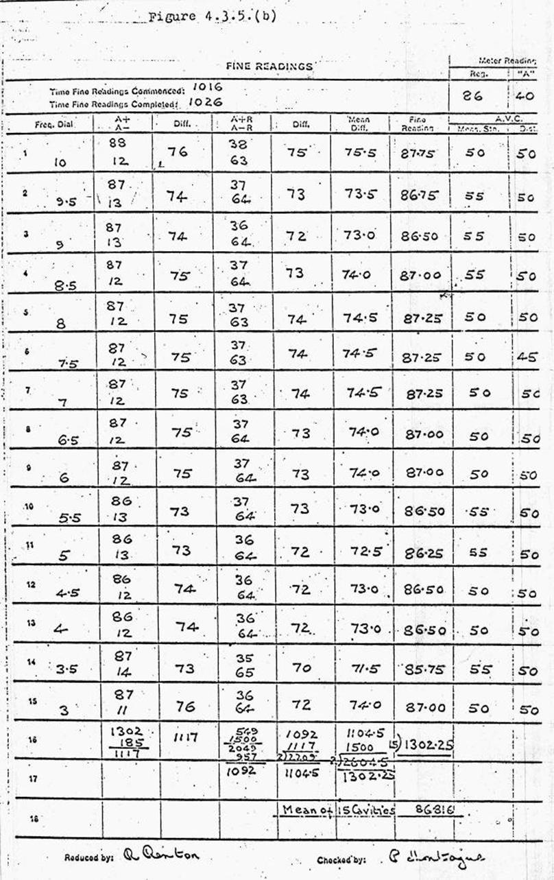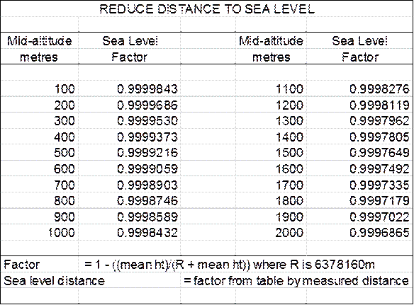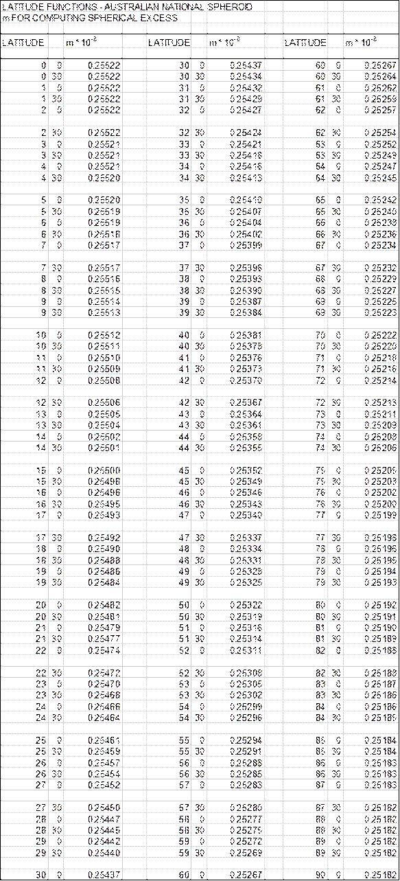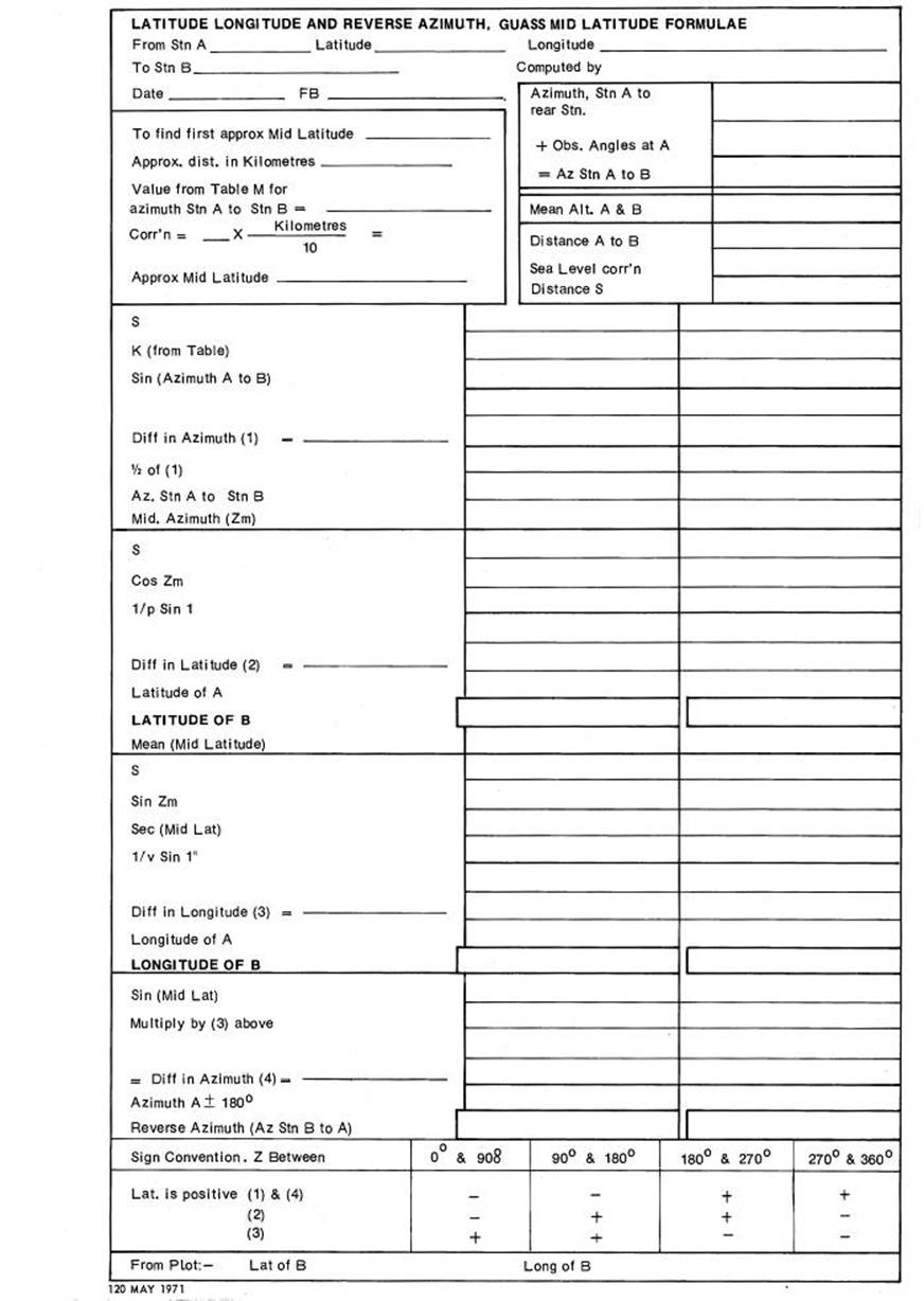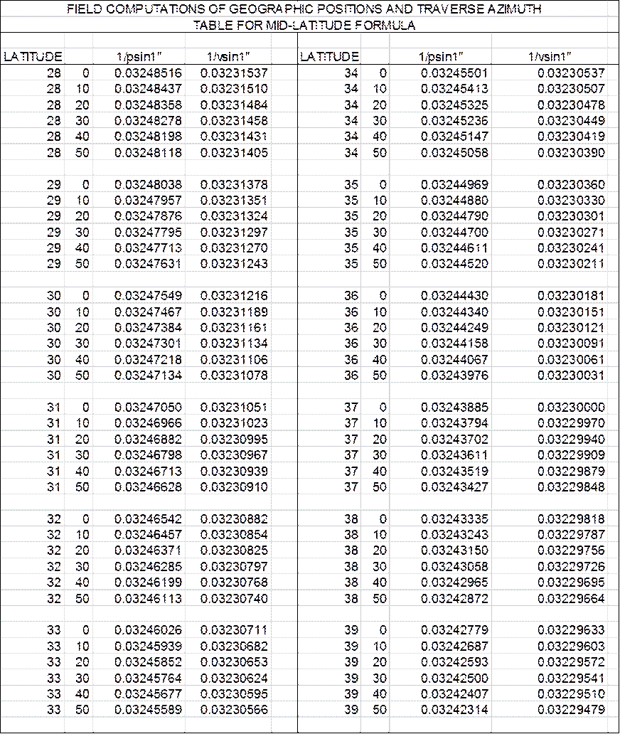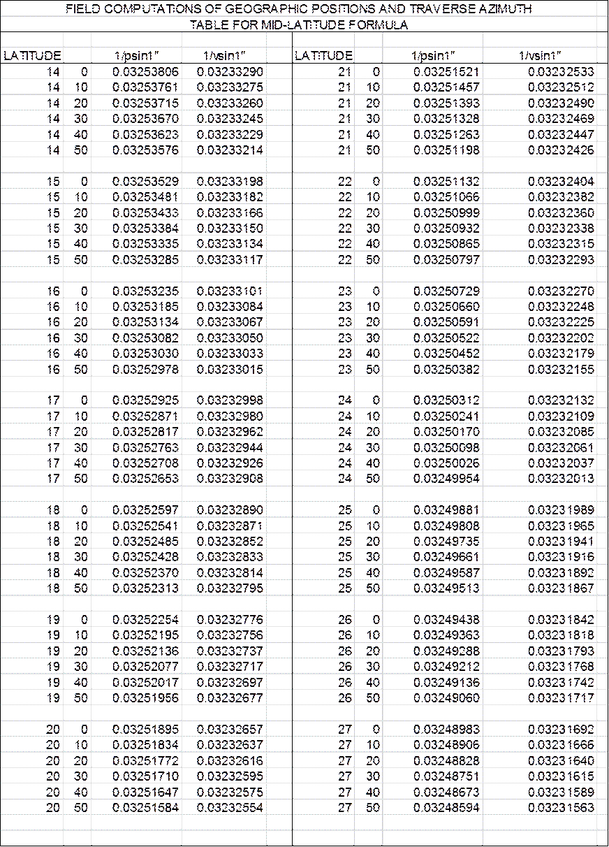 The value of one division of the T3 alidade bubble is about 6 seconds of arc; divide this by 15 and multiply by secant Latitude and Cosecant of the approximate azimuth to get the value of one division in seconds of time. This is done for an azimuth of 90° and also for 80° and 100° to cover the various bearings of the stars used in this observation. Interpolate for the bearing of each star observed; this value is multiplied by the mean bubble correction from the field book.