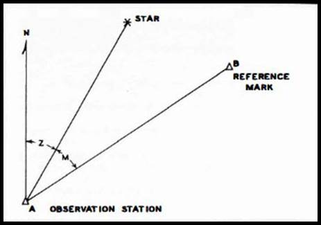 Also, from the observation on the star S, the observed azimuth of the line is equal to Z the computed azimuth of the star, plus dZ the differential change due to the errors dλ and dφ, in the assumed longitude and latitude of the observation station A, plus M the angle measured clockwise from the star to the reference line.